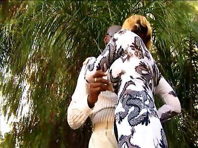 Young ash-blonde fledgling fellating a massive man rod outside