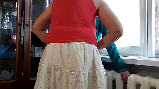 Petite girl only in pantyhose under micro-skirt needs to Jizm several times after college while her parents was not at home!